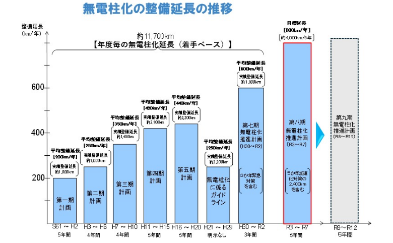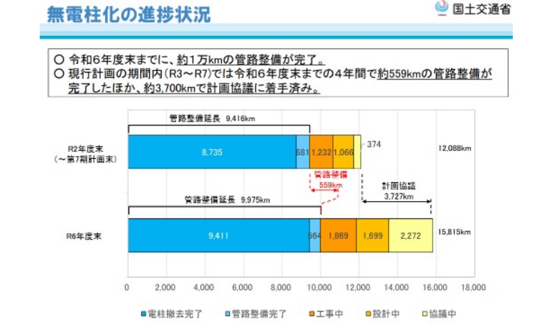 昭和61年(1986年)から始まった無電柱化推進計画(当時は電線類地中化計画)から早40年が経過しました。 国土交通省の資料によると、この間で整備完了した無電柱化路線は9,975㎞(令和6年度末)としています。約1万㎞といったところで、進捗のスピードは250㎞/年です。