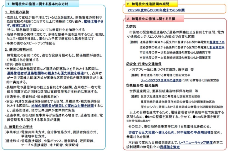 八潮市の道路陥没事故を受けて、占用物件の安全性や維持管理の状況を定期的に確認するなどの項目が入った。また、電柱の老朽化による倒壊なども発生していることから、撤去のタイミングで無電柱化を同時に施工するなども必要だろう。