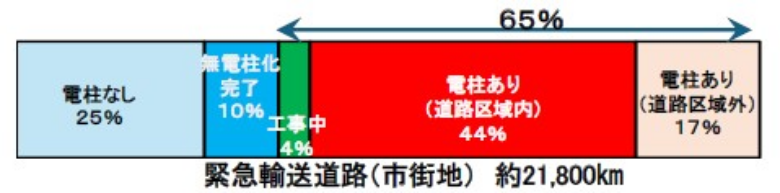 そういう意味でも、緊急輸送道路の電柱を減らすのは喫緊の課題だ。しかし、市街地の緊急輸送道路約21,800㎞のうち約65%の区間で電柱が残っている。このうち26%は道路区域外(沿道民地)だ。