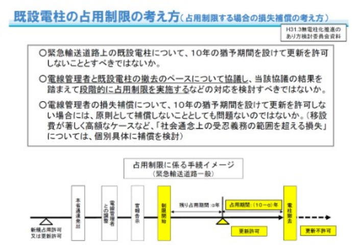 以前の無電柱化推進のあり方検討委員会で議論された既設電柱の占用制限の考え方では、占用制限をかけて10年経てば電柱を撤去させることができ、それは違法ではないという結論になっていたが、現在、この考え方を適用したという事例は聞かない…。