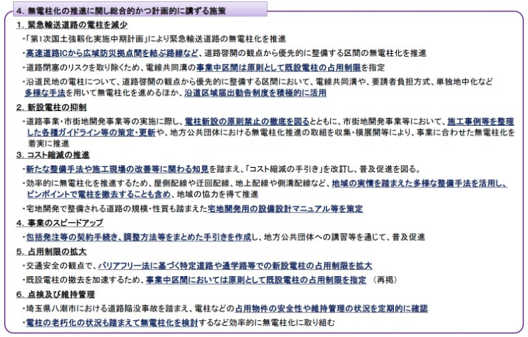 防災目的の無電柱化推進計画では、次期計画から指標として、着手率から整備完了率、計画策定率に変更して、実質的な無電柱化された延長を目標とするようにしている。(ただし、抜柱までではないので、工事は終わっているが、見た目は電柱が残っている状態)。 また、切迫する巨大地震へ備えるために、30年程度の中長期目標を定めるとある。