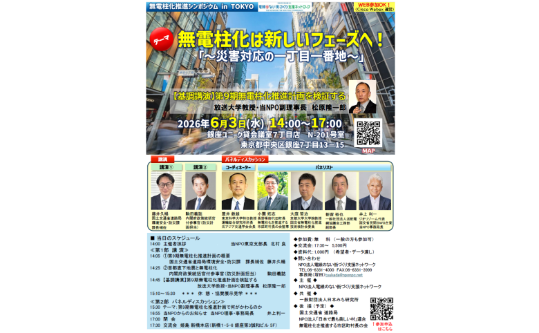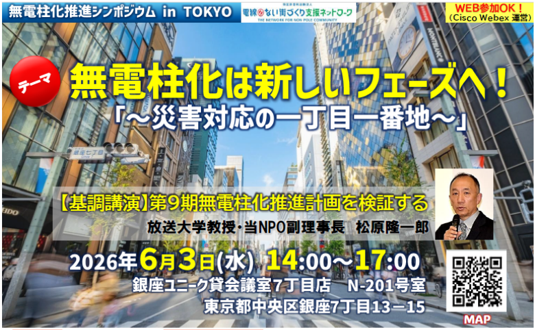 2026年度より第9期無電柱化推進計画が始まります。その発出時のタイミングでいち早く当NPOから情報発信いたします。 推進計画の内容を国土交通省道路局 環境安全・防災課の藤井課長補佐に、さらには、内閣府 政策統括官付参事官(防災計画担当)の駒田様に防災と無電柱化の関係性について解説していただきます。