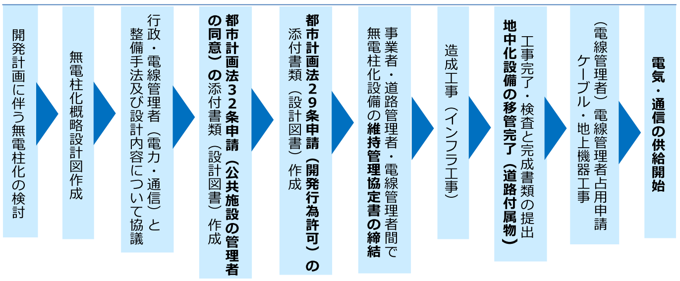 市街地開発事業等における新設電柱の抑制を図るため、電線共同溝方式によらずに実施される無電柱化に対する支援を行い、地方公共団体と連携を図りつつ、小規模事業も含めた無電柱化の取組を促進する。