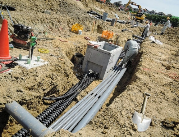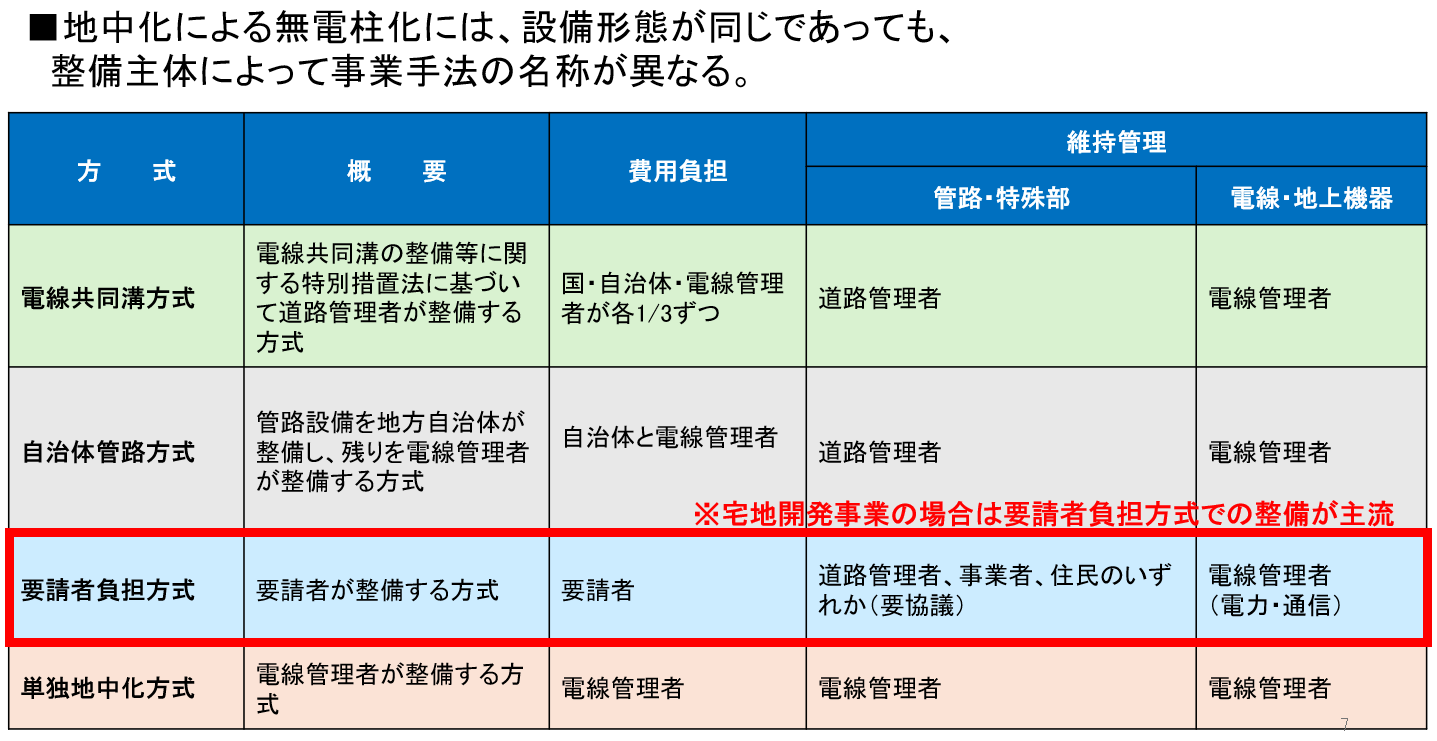 自営設備方式:開発事業者が整備し、地中化される管路等工作物を電線管理者及び自治体以外の者(開発行為により築造される道路に面する土地所有者等による管理組合を含む。)が管理する方式
