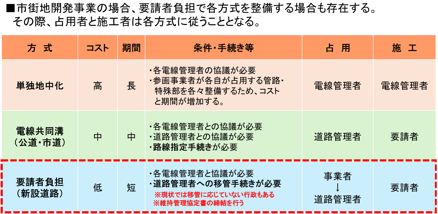 ・市街地開発事業の場合、要請者負担で各方式を整備する場合も存在する。その際、占用者と施工者は各方式に従うこととなる。